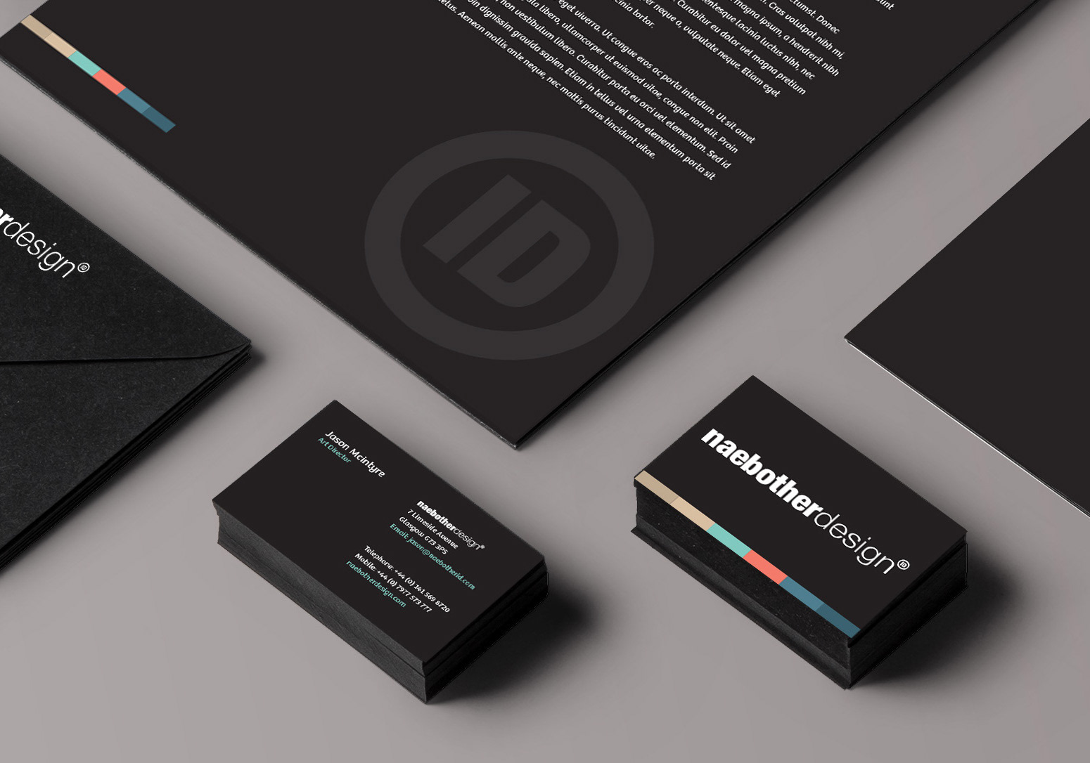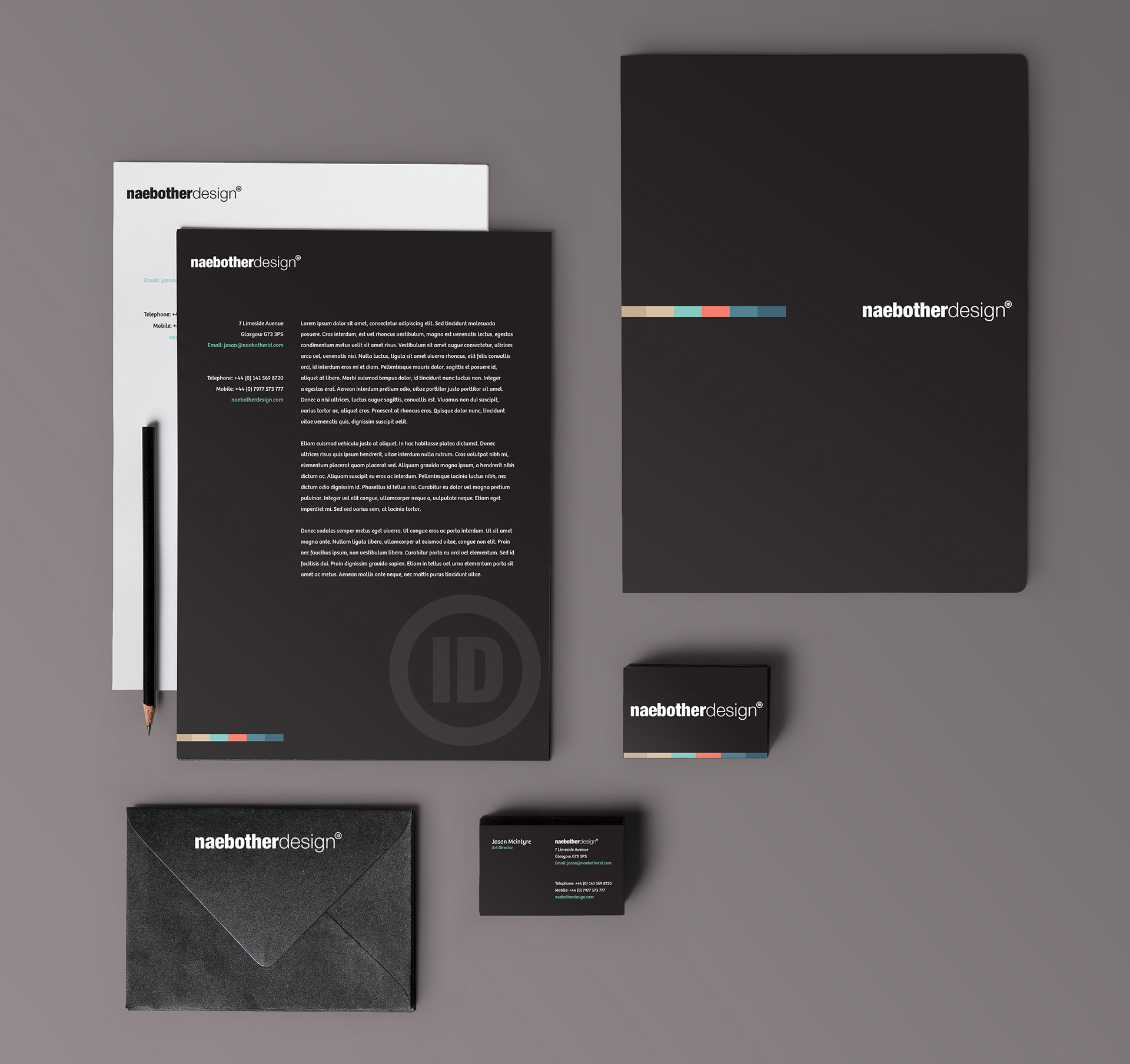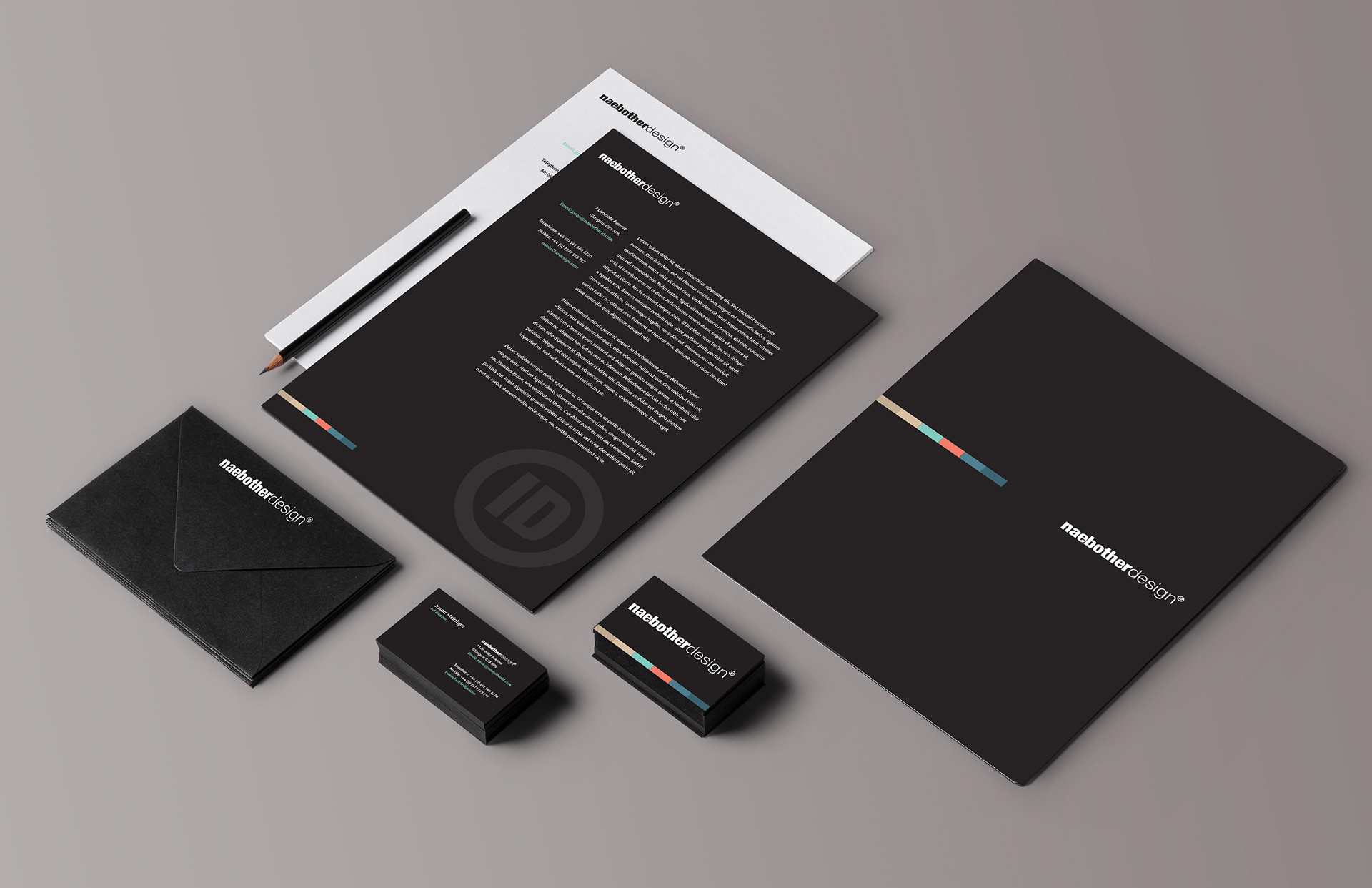 This identity was created for a small design and advertising agency. The name was derived from a colloquial Scottish expression meaning we're happy to help; whatever you require it's naebother.